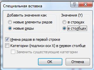 Изменение ряда данныхДобавление нового ряда данных Удаление ряда данных Чтобы удалить ряд данных, выделите его и нажмите клавишу <Delete>. Ряд данных будет удалён из диаграммы. Конечно, данные на рабочем листе останутся в неизменном виде. Довольно часто требуется добавить новый набор данных в существующую диаграмму. Excel предлагает несколько способов выполнения этой операции. Ø Активизируйте диаграмму, а затем выберите команду Конструктор → Выбрать данные. В диалоговом окне Выбор источника данных перейти к Элементы легенды (ряды). Щёлкните на кнопке Добавить. А затем введите имя нового ряда и значение. Ø Выделите нужный диапазон данных и нажмите Копировать. Затем активизируйте диаграмму и выберите на вкладке Главная команду Вставить → Специальная вставка. Появится диалоговое окно, показанное на рис.9.7.