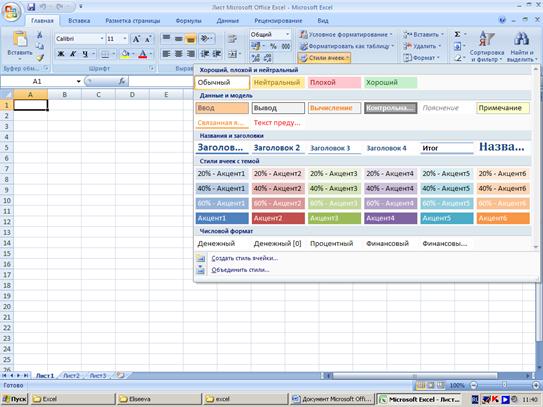 Применение автоформата Автоматические форматы Excel – это заранее определенные сочетания числового формата, шрифта, выравнивания, границ, узора, ширины столбца и высоты строки. В целях экономии времени при форматировании таблицы можно воспользоваться командой Автоформат. Для этого: 1. Выполните выделение диапазона ячеек. Затем выберите ГлавнаяÞСтилиÞСтили ячеек. 2. В появившемся окне выберите нужный формат.