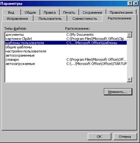 Word звичайно зберігає шаблони як файли з розширенням DOT у папці ШАБЛОНИ. Ця папка знаходиться в папці MSOFFICE. Шаблони зберігаються у визначеному місці, щоб вони були легко доступні незалежно від того, у якій папці працює користувач. Вкладки, що з'являються в діалоговому вікні «Создание документа» («Створення документа»), відповідають папкам, що знаходяться в папці ШАБЛОНИ, а елементи вибору в цих вкладках відповідають файлам з розширенням DOT. Щоб змінити установки за замовчуванням, необхідно вибрати команду «Сервис, Параметры» («Сервіс, Параметри»), вибрати вкладку «Розташування» («Расположение»), виділити «Шаблоны пользователя» («Шаблони користувача») і натиснути кнопку «Изменить» («Змінити»). З'явиться діалогове вікно, у якому потрібно вказати нове розташування папки із шаблонами