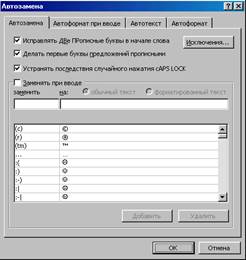Рис. Вікно діалогу «Закладка» 4.5. Спеціальні засоби редагування У процесі редагування можна використовувати інструмент пошуку і заміни, що дозволяє знайти в документі потрібне місце або формат, а також здійснити контекстну заміну усіх входжень зазначених символів. Обов'язковою вимогою сучасних текстових редакторів, є наявність засобу перевірки орфографії. Задача перевірки орфографії полягає в тому, щоб полегшити редагування, і від того, як повно ця задача вирішена, залежить якість текстового редактора. На заключному етапі редагування виконується перенос слів, що дозволяє більш компактно розмістити текст у документі. 4.5.1. Автозаміна Автозаміна – засіб для автоматичної корекції помилок, вставки в документ фрагментів тексту, графіки, таблиць і т.п. Засіб автозаміни може виправляти часто зустрічаються помилки (наприклад, уведення «дял» замість «для»). З огляду на можливі типи помилок подібного роду, MS Word передбачає близько 400 варіантів замін різних часто зустрічаються помилок. Можна доповнювати цей список своїми замінами.