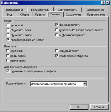 Друк ФОРМИ Підключення макросів до форми Макрос – це послідовність дій, об’єднана однією командою. Для її виконання можна призначити кнопку або клавішну команду. У макрос можна об’єднати ряд стандартних процедур, на виконання яких регулярно приходиться витрачати час. Використання макросів дозволяє автоматизувати форму в багатьох відношеннях. Наприклад, макроси можуть включати та відключати поля форми в залежності від заповнення інших полів. Можна автоматично заповнювати деякі поля та навіть змінювати структуру форми по мірі її заповнення. Макроси, які приєднуються до поля форми, повинні бути створені наперед. Запускаються макроси автоматично при настанні двох подій: вході у поле форми та виході з поля форми. Перша подія настає, коли поле форми виділяється для заповнення (у текстовому полі форми з’являється курсор, прапорець підсвічується, а біля поля зі списком з’являється кнопка зі стрілкою). Друга подія настає, коли для заповнення виділяється яке-небудь інше поле. Щоб макроси були корисні, необхідно зберегти їх в шаблоні форми (а не в загальному шаблоні). Це можна зробити або при створенні макросу, або пізніше за допомогою команди “ Организатор… ”. Для приєднання макросу до полю форми необхідно виконання двох умов: захист форми повинен бути знятий та макрос підготовлений. Для призначення макросу полю форми необхідно: 1. Виділити поле форми та відкрити діалогове вікно “ Параметры поля формы ”. 2. У групі “ Выполнить макрос ” у списку “ при входе: ” вибрати макрос, який повинен виконуватися при вході у поле форми. У списку “ при выходе: ” вибрати макрос, який повинен виконуватися при виході із поля форми. Якщо списки “ при входе: ” та “ при выходе: ” порожні або не містять потрібного макросу, це означає, що макрос або не був створений, або не приєднаний до шаблону форми. Форму можна надрукувати трьома способами: надрукувати форму цілком, включаючи тексти міток, графіку та дані у заповнених полях, можна надрукувати тільки дані у полях форми або тільки текст міток та графіку і отримати тим самим бланк форми. Друкувати тільки дані форми потрібно у тому випадку, коли використовуються завчасно підготовлені бланки форми. Якщо бланк форми був створений за допомогою того самого шаблону, який використовувався для заповнення форми, можна бути упевненим, що дані потраплять на призначені для них місця в бланку форми. Для друку тільки даних форми необхідно: 1. Вставити бланк форми у принтер. 2. Вибрати команду “ Сервис, Параметры ” (рис. 9). 3. Розкрити вкладку “ Печать ”. 4. Встановити прапорець “ Печатать только данные для форм ”. Зверніть увагу, що при цьому для даного документа завжди будуть друкуватися тільки дані форми, поки не буде скинутий відповідний прапорець.