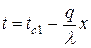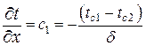 х=0, t=tс1, х= Это есть полная математическая формулировка данной задачи, в результате решения которой должны быть найдены распределение температуры в плоской стенке, а также получена формула для определения плотности теплового потока. Закон распределения температур по толщине стенки найдется в результате двойного интегрирования. Первое интегрирование дает После второго интегрирования: t=c1x+c2. Постоянные с1 и с2 определим из граничных условий. При х=0, t=tс1 и с2=tc1; при х= Подставляя значения постоянных с1 и с2 в уравнение получаем закон распределения температуры в плоской стенке