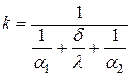 Величина k называется коэффициентом теплопередачи, Вт/(м2К). Характеризует интенсивность передачи теплоты от одной жидкости к другой через разделяющую их стенку и численно равен количеству теплоты, которое передается через единицу поверхности стенки в единицу времени при разности температур между жидкостями в один градус. Величина, обратная коэффициенту теплопередачи, называется полным термическим сопротивлением теплопередачи