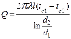 где Q измеряется в Вт. Видно, что количество теплоты, проходящее через цилиндрическую стенку в единицу времени, не зависит от радиуса. Тепловой поток может быть отнесен либо к единице длины трубы, либо к единице внутренней или внешней поверхности. При этом плотность теплового потока через единицу внутренней поверхности, Вт/м2