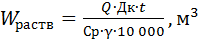 где Q – расчётный расход обрабатываемой воды, м3/час; Дк – расчётная доза реагента по безводному продукту, г/м3; t – время приготовления раствора реагента, час; t = 10-12 час., если малая производительность t = 12-24 час. Cp – концентрация раствора коагулянта в растворных баках в %, принимают до 17%; γ – плотность раствора, т/м3 (γ = 1т/м3).