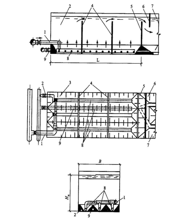 Рисунок 2.6 – Встроенная камера хлопьеобразования со слоем взвешенного осадка: 1 – подача оды; 2 – трубопровод опоражнения; 3 камера хлопьеобразования; 4 – поперечные перегородки; 5 – водослив; 6 – полупогружная перегородка; 7 – горизонтальный отстойник; 8 – водораспределительные трубы; 9 – сброс осадка из отстойника.