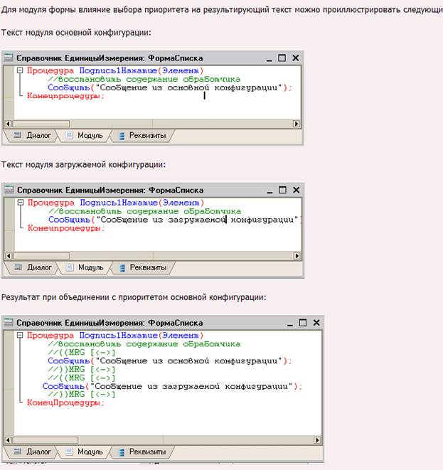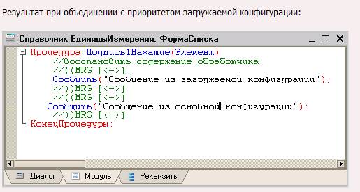 Режим объединения можно установить для каждого объединяемого объекта. Существует два вида режима: «Взять из загружаемой конфигурации» и «Объединять...», во втором случае обычно указывается приоритет конфигураций при объединении. Выбор «Взять из загружаемой конфигурации» означает, что объект конфигурации будет добавлен, если он новый, или замещен, если он измененный. Причем переносится вся структура объекта, модули, описания, формы. При этом приоритет однозначно отдается загружаемой конфигурации. При выборе метода «Объединять ...» происходящее при объединении конфигураций зависит от установленного приоритета. Если из загружаемой конфигурации необходимо взять только новое и максимально сохранить старое, необходимо выбрать «Объединить» с приоритетом основной конфигурации. В этом режиме добавляются только новые объекты. Тексты объединяются следующим образом: