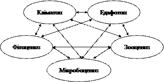 Як видно із рис. 1.9., всі компоненти біогеоценозу є взаємопов’язаними. Отже, біогеоценоз як система взаємовідношень складових його компонентів, характеризується певним типом обміну речовиною і енергією між його компонентами та іншими компонентами природи і являє собою внутрішню діалектичну єдність компонентів, що знаходяться в постійному русі.