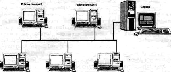 Мал. 6. При топології зі спільною шиною робочі станції та файлові сервери підключені до спільного кабеля