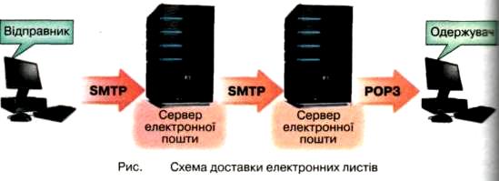Кожна електронна поштова скринька має унікальну адресу. Адреса електронної поштової скриньки складається з імені користувача, під яким він зареєстрований на сервері електронної пошти, та доменного імені сервера, розділених символом @ (англ. комерційне at – на). Наприклад, поштова адреса pupil@school.region.ua означає, що для користувача pupil створена поштова скринька на сервері з доменним іменем school.region.ua. Ім'я користувача, під яким він зареєстрований на сервері електронної пошти, називають логіном (англ. log in – вхід до системи). На комп'ютерах користувачів для отримання послуг електронної пошти встановлюють спеціальні програми – поштові клієнти. Поштові клієнти призначені для підготовки, відправлення, отримання та опрацювання електронних листів, що передаються службою електронної пошти. Поштові клієнти належать до прикладних програм загального призначення. Популярними є програми Outlook Express, The Bat!, Mozilla Thunderbird, Opera Mail, Netscape Messenger та ін. Поштові клієнти відрізняються один від одного інтерфейсом та окремими функціями, але використання більшості з них надає користувачам такі можливості: • підготовка тексту листа; • відправлення листа одному чи групі адресатів; • прикріплення до листа файлів різних форматів; • перевірка орфографії в текстовому повідомленні; • автоматичне додавання електронного підпису; • отримання та зберігання електронних листів; • створення папок для впорядкованого зберігання листів; • інформування користувача про надходження нових листів; • сортування та фільтрація вхідних листів за встановленими правилами; • пересилання отриманих листів іншим адресатам; • цитування тексту отриманого листа у відповіді на нього; • видалення електронних листів; • формування та використання адресної книги – засобу для впорядкованого зберігання поштових адрес та їхнього швидкого введення; • шифрування/дешифрування електронних листів; • включення до листів запиту на підтвердження факту отримання листа адресатом та ін. При створенні поштової скриньки на веб-сайті для користування нею можна використовувати браузер. При цьому говорять про роботу з електронною поштою через веб-інтерфейс. З використанням веб-інтерфейсу можна звернутися до поштових скриньок, створених на сайтах веб-пошти та порталах, наприклад, FREEMAIL http://freemail.ukr.net), Мета (http://webmail.meta.ua), Mail.Ru (http://mail.ru), Gmail (http://gmail.com), Яндекс (http://mail.yandex.ru) та ін. Пересилання електронних листів між сервером електронної пошти та комп'ютером клієнта називають доставкою пошти. Для пересилання повідомлень використовують протоколи електронної пошти (рис.1): – РОРЗ (англ. Post Office Protocol version 3 – протокол поштового відділення версії 3) - визначає правила пересилання поштових повідомлень від поштового сервера до комп'ютера користувача; – SMTP (англ. Simple Mail Transfer Protocol – простий протокол пересилання пошти) – визначає правила пересилання поштових повідомлень від комп'ютера користувача до поштового сервера або між поштовими серверами. Доставка електронних листів відбувається за лічені хвилини, затримка може виникнути через збої в роботі поштових серверів і мережного обладнання.