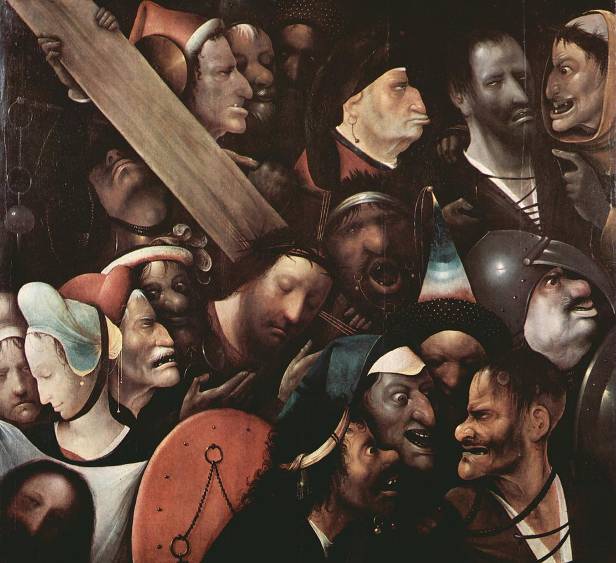 Иероним Босх неоднократно обращался к сюжету Христовых страданий. Картина «Несение креста») окрашена индивидуальным переживанием, личной болью. Вся её плоскость заполнена человеческими лицами: теснятся физиономии стражников, палачей, праздных зевак — грубые, уродливые. Еще более страшными делают эти лица, переполняющие их фанатичная жестокость, равнодушие к страданиям другого, тупое злорадство. На фоне этого человеческого зверинца особенно прекрасными кажутся спокойные и кроткие лица Христа и Святой Вероники, в руках которой белый платок с нерукотворным образом Спасителя. Христос идёт навстречу своей смерти: направо, в ту сторону, которая в средневековом искусстве отводилась для изображений, связанных со смертью и грехом. Вероника движется налево, в мир жизни, унося на платке лик Христа.