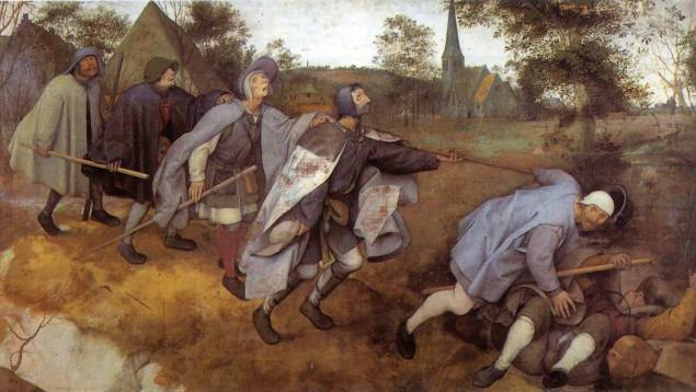 В картине «Слепые» — это одна из последних работ Брейгеля — чувствуется философское неприятие религиозного и политического фанатизма. Источник сюжета — Евангелие от Матфея (15, 12-19). Христос сказал, имея в виду фарисеев: «Если слепой ведет слепого, то оба упадут в яму». Эта притча о человеческой глупости неоднократно встречается в писаниях гуманистов. Но трагическая глубина и убедительность образа, созданного Брейгелем, придает этой теме особую силу воздействия.