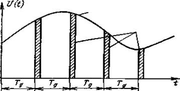 Теорема Котельникова. Можливість передачі безперервних сигналів за допомогою його дискретних відліків була обґрунтована В. А. Котельниковим в 1933 році. Відповідно до теореми Котельникова, будь-який безперервний сигнал, обмежений по спектрі верхньою частотою FB, повністю визначається послідовністю миттєвих значень амплітуди, узятих через проміжок часу Тд ≤ 1/2 FB. Таким чином, якщо потрібно передати безперервний сигнал U (t ) з обмеженим спектром, те, не обов'язково передавати весь сигнал, а досить передати лише окремі миттєві значення амплітуди, відлічені через інтервали часу Тд (рис. 3.1). З таких відліків значень амплітуди може бути повністю відновлений вихідний безперервний сигнал.