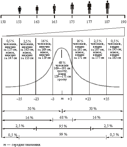 Рис. 17. Нормальний розподіл людей за зростом Група показників технологічності характеризує властивості продукції, які визначають можливості оптимізації витрат матеріалів, праці, засобів і часу за технологічної підготовки її виробництва, продукування і використання. Показники якості цієї групи уможливлюють оцінювання особливих властивостей виробу як об’єкта проектування, виробництва та експлуатації (рис. 18).