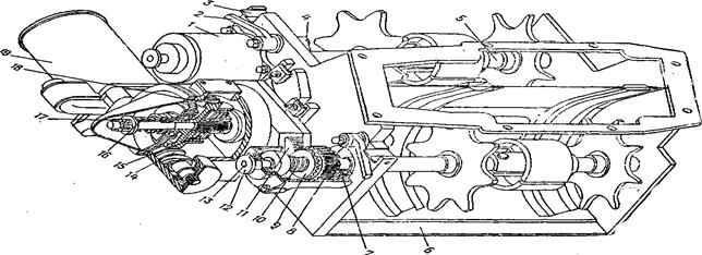 Опора прифланцована до коробки 6 і призначена для відключення валу від редуктора; вона складається з шестерні 8, на торці якої нарізані зуби храпового зачеплення, втулки 9 з торцевими зубами храпового зачеплення, що підтискається до шестерні 8 пружиною 10. Шестерня встановлена на валу зірочок на кулькових підшипниках, а втулка — на шліцах валу. Втулка пов'язана з віссю 13 з ручкою 12. Редуктор складається з черв'ячної передачі (черв'яка 14 і черв'ячного колеса 18), що здає муфти 15 і циліндрових шестерень. Передавальне відношення редуктора підібране так, щоб лінійна швидкість стрічки з приводом від зірочок була на 20% більше швидкості руху стрічки при великому темпі стрілянини з гармати. Лінійні швидкості вирівнюються за рахунок тієї, що пробуксувала здаючої муфти 15. Стопорний механізм, що складається з храповика, розташованого на валу, і собачки 4, виключає зворотне обертання валу і натягнення патронної стрічки. Гвинтовий рукав 16 і горловина служат ь для розміщення, повороту і підведення патронних стрічок від механізму підтягування до гнучкого елементу 3. Гвинтовий рукав кріпиться до фланців роздаточної коробки і горловини /. Горловина кріпиться до пластини, закріпленої на даху башти. Гвинтовий рукав і горловина є жорсткими зварними конструкціями, розділеними на два канали для проходу двох патронних стрічок. Гнучкий елемент 3 забезпечує подачу патронних стрічок від нерухомої горловини до приймальних вікон гармати на всіх кутах прокачування. Гнучким елементом є пакет пластин, що прокачуються щодо труби, закріпленої на обоймі 3 (мал. 33). Хвостовою частиною пластини спираються на шток, шарнірно закріплений на кожусі гармати і на горловині. При прокачуванні гармати шток повертає пластини гнучкого елементу 3 (мал. 58) віялом. Вікна в пластинах утворюють два канали для напряму патронних стрічок. Для виключення проникнення порохових газів з кожуха гармати в бойове відділення служать ущільнення 2 і 17. Ущільнений і е 2 закриває гнучкий елемент і є гофрованим чохлом, що застібається ременями і закріплений за допомогою тросів із замками на фланці кожуха гармати і на фланці горловини. Ущільнення 17 закриває гвинтовий рукав і застібається ременями.