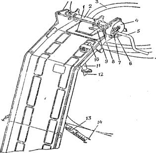 Мал. Лоток: 1 — планка; 2— вал; 3— люк оператора; 4— редуктор; 5 — ручка; 6 — ручка фіксатора; 7 — чека; 8, 10 — важелі; 9 — напрямна; 11 — стійка; 12 — стрижень; 13 — ремені; 14 — скоба