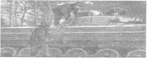 - бере сумки з гранатами, запалами і сигнальними патронами і передає їх командирові машини; - подає кінець стрічки з БТ снарядамипетлею ланки вперед і допомагає командирові направляти стрічку в люк командира (мал. 7);. - через праві двері десантного відділення подає командирові два магазини до кулемета ПКТ; - подає навідникові-операторові ПТУР головною частиною вгору; - по команді навідника-оператора включає (вимикає) вимикач акумуляторних батарей. Старший стрілець-десантник: - займає місце на сидінні десантного відділення біля правих дверей; - приймає від стрільця-гранатометника п'ять патронних коробок ємкістю на 200 патронів і передає їх кулеметникові правого борта; - переходить на сидінні десантного відділення біля лівих дверей; - приймає від стрільця-гранатометника дві коробки ємкістю на 100патронів і передає їх кулеметникові лівого борту; - приймає від гранатометника гранатометі дві сумки з гранатами до нього і кріпить їх в укладанні на лівому борту. Кулеметник правого борту: - займає своє робоче місце; - приймає від старшого стрільця п'ять патронних коробок на 200 патронів і кріпить чотири з них в ніші і одну на правому борту корпусу. Кулеметник лівого борту: - займає своє робоче місце; - приймає від старшого стрільця дві коробки ємкістю 100 патронів і кріпить їх в укладаннях лівого борту; - переходить на робоче місце старшого стрільця; - приймає від гранатометника послідовно одну патронну коробку на 100 патронів, коробку-закупорювання на 440 патронів, одну коробку на 100 патронів і одну коробку на 200 патронів і кріпить дві патронні коробки на 100 патронів і коробку-упакування в укладання праворуч від сидіння і коробку на 200 патронів зліва від сидіння. Стрілець-гранатометник: - займає вихідне положення біля укладеного на брезенті боєкомплекту; - бере і подає через праві двері старшому стрільцеві п'ять патронних коробка ємкістю 200 патронів; - бере і подає через ліві двері старшому стрільцеві дві патронні коробки ємкістю 100 патронів, гранатомет і дві сумки з гранатами до нього; - передає кулеметникові через люк старшого стрільця послідовно одну патронну коробку на 100 патронів, коробку-укупорку на 440 патронів до кулемета, одну патронну коробку на 100 патронів і одну патронну коробку на 200 патронів; - бере коробку-закупорювання ємкістю 700 патронів до автоматів і закріплює її на контейнері акумуляторних батарей. У випадку якщо в процесі укладання стрічок з патронами до гармати відмовить електропривод механізму підтягування стрічки, її підтягування можливо проводити вручну. Для підтягування стрічки вручну необхідно: - повернути башту вліво в положення 17-00; - вийняти із ЗІП спеціальну рукоятку, приєднати її до валу редуктора і з її допомогою обертати редуктор механізму підтягування. Приєднання рукоятки до валу редуктора, його обертання здійснює механік-водій з місця старшого стрільця-автоматника. При укладанні в машину контейнерів з ПТУР 9М111, розміри яких менше розмірів контейнерів для ПТУР 9М113, необхідно заздалегідь в замки штатних укладань укласти гумові прокладки, при цьому прокладки білого кольору укладаються в передні замки, а чорного — в задні. Якщо в процесі бойових дій виникнуть перерви, то їх необхідно використовувати для поповнення боєкомплекту. Для поповнення боєкомплекту до гармати необхідно: - витягнути стрічки з трактів живленн
