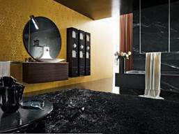 Черный цвет в ванной: правильные решения Так как черный цвет и его оттенки имеют свойство поглощать свет, использовать их в интерьере следует с высокой степенью осторожности. Именно с непрофессионально оформленных ванных комнат, да и прочих жилых помещений в черном цвете и собрано мнение о мрачности и тусклости. Конечно, черный цвет очень утомляет, если сделать подобную отделку на кухне или в гостиной, неверно декорировать помещение и устроить плохое освещение. В результате и негативное мнение, и нервы, и усталость. Чтобы все это изменить, следует понимать, что нельзя оформлять жилые и часто посещаемые места в подобных оттенках, а если и так, то обязательно следует профессионально работать с интерьером и освещением. Касается это и ванной комнаты, и, видимо, в первую очередь, потому как, если вы создадите даже очень красивую и практичную ванную в темных оттенках, но не обеспечите стабильно правильное освещение ванной, то вся работа пойдет насмарку. Итак, самое главное в нашей задаче, это не переборщить с черным цветом и не перенасытить им ванную комнату. Интерьер ванной комнаты в черном цвете будет действительно гармоничным только в том случае, если вы сможете правильно комбинировать цвета. Нельзя сделать все черным и пытаться понять, почему в этом случае вы получили темную коморку, а не комфортную ванную комнату. Здесь не поможет даже хорошее освещение, не справятся с задачей и мощные прожектора... Итог - перенасыщение черным цветом. Чтобы не допускать подобных ошибок, еще до начала ремонтных и отделочных работ определитесь с контрастом, подберите к черному другие цвета и оттенки, но не забывайте, что относится это не только к внешним данным помещения, но и к наполнению. Сантехника, мебель и аксессуары должны быть в идеальной гармонии с общим дизайном. Отделка. Давайте поговорим об отделке ванной комнаты в темных тонах. Это может быть керамическая плитка или любой другой удобный вам материал. Черным цветом можно расставить строгие и эксцентричные акценты, оформить черные бордюры, которые разделяют помещение на функциональные зоны, задать настроение, сочетая черный с белым или черный с красным и, наконец, оформить ванную комнату по примеру классики или минимализма. Здесь можно задействовать общий дизайн ванной комнаты в черном цвете, или же оформить помещение зонально: частично потолок, стены, пол и так далее. Мебель. Черная мебель в ванной комнате смотрится действительно строго, но именно этим она и завершает выбранный вами стиль. Это достаточно редкий вариант, который повысит оригинальность и придаст некий шик помещению, если, например, сочетать мебель с большим количеством стеклянных, металлических и других глянцевых поверхностей. Сантехника. Это и вообще, практически эксклюзивный вариант для ванной комнаты, но черная сантехника в ванной сделает ее неповторимой, особенно богатая, керамическая, с некоторыми перламутровыми отливами. Хорошо подойдет подобный вариант под восточный стиль, а также под всем известный и популярный минимализм.