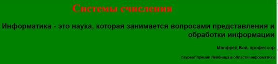 3. Расположил текст в соответствии с образцом. Для этого: Слова Системы счисления оформил как заголовок первого уровня, по центру и сделал красного цвета. Эпиграф – курсив, Arial, размер 3, параграф выровнен по правому краю. Подпись под эпиграфом («Манфред Брой ….») – параграф выровнен по правому краю, курсив.