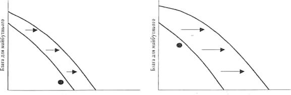Умови ефективного використання ресурсів. Основною умовою ефективного використання ресурсів є економічне зростання. Економічне зростання — це здатність економіки виробляти більший обсяг продукції (виражається в переміщенні кривої виробничих можливостей вправо) в результаті збільшення пропозиції ресурсів і технічного прогресу. Завдяки економічному зростанню економіка здатна одночасно виробляти більше масла і тракторів. Якщо у статичній економіці, тобто за відсутності зростання, треба пожертвувати частиною масла, щоб отримати більше тракторів, то в динамічній, зростаючій економіці водночас виробляють більші обсяги обох продуктів. Однак економічне зростання не супроводжується пропорційним зростанням виробництва всіх видів продуктів. Тут можливі різні варіанти. Наприклад, економіка виробляє вдвоє більше споживчих благ, а зростання виробництва капітальних благ становить лише 60%. Нині економічне зростання характерне для всіх розвинутих країн світу, крива їхніх виробничих можливостей постійно перемішується вправо. Проблема полягає лише в тому, як швидко відбувається це переміщення. Проте за певних умов крива трансформації може переміщуватися і вліво, що спостерігається нині в Україні та в деяких інших країнах, що виникли внаслідок розпаду СРСР. Скорочення обсягу національного виробництва є результатом зміни соціально-економічного ладу і труднощів, що пов'язані із переходом від командно-адміністративної системи до ринкової. Дуже суттєвим фактором для України є й те, що одночасно із переходом до ринкової системи (на практиці реформування економіки відбувається надто повільно) їй доводиться у неймовірно складних внутрішніх і зовнішніх умовах розв'язувати ще одне, не менш важке завдання — розбудовувати свою державність. Нинішній вибір точки на кривій трансформації є основним визначником майбутнього положення цієї кривої. Щоб зрозуміти це твердження, відкладемо на осях кривої виробничих можливостей "блага для сьогодення" й "блага для майбутнього". "Блага для сьогодення", або поточні блага, є споживчими товарами — продукти харчування, одяг, житло, холодильники, автомобілі тощо. "Блага для майбутнього", або "інвестиційні блага", — це устаткування, наукові дослідження й освіта, профілактична медицина та ін. "Блага для майбутнього" збільшують кількість і якість матеріальних ресурсів, підвищують продуктивність праці, визначають економічне зростання в майбутньому
