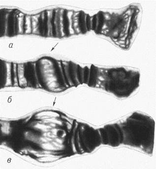 Рис. 6. Динамика образования пуфа: а — нефункционирующая (спирализованная) хромосома, видна ее дискоидальная структура; б — начальное развитие пуфа, слабая деспирализация хромосомы, видны хромонемные нити; в — максимально развитый пуф, сильная деспирализация (по: Жимулев, 2003). Исследование БТШ происходило не только на дрозофиле. Пресноводная гидра Hydra oligactus неспособна синтезировать БТШ и погибает при незначительном прогревании. Близкий вид Hydra attenuata имеет нормальный синтез БТШ и выживает при таком же температурном воздействии (Bosch et al., 1988). Дальнейшие исследования показали, что синтез БТШ в ответ на тепловой стресс идентифицирован у широкого спектра организмов — от бактерии до человека (Schlesinger et al., 1982). Подтверждением защиты клетки БТШ от повреждений, вызванных гипертермией, является то, что организмы, не синтезирующие БТШ в ответ на тепловой шок, крайне термочувствительны. У ранних эмбрионов Drosophila melanogaster не происходит синтеза БТШ при действии ТШ (Dura, 1981; Foe, Alberts, 1985), поэтому период раннего эмбриогенеза D. melanogaster является удобной естественной моделью для изучения последствий действия ТШ в отсутствии синтеза БТШ. БТШ индуцируются не только на действие высоких температур, но и при разнообразных стрессорных воздействиях на организм. Например, помимо непосредственного участия всех БТШ в защите клеточных белков от разных видов денатурации и окисления, БТШ с помощью различных еще до конца не изученных механизмов участвуют в защите клеток от стресс-индуцируемого апоптоза, блокируя пути его активации и стабилизируя клеточные структуры. Подобный ответ на стрессорные воздействия был обнаружен у самых разных организмов, как эукариот, так и прокариот (Tanguay, 1988). В клетке синтезируется несколько фракций БТШ с различными молекулярными массами (Feder, Hofmann, 1999). Фракции БТШ разных организмов, приблизительно соответствуют друг другу по молекулярной массе. Общепринятой стала классификация, основанная на разделении БТШ по молекулярным массам на несколько семейств (Lindquist, 1986): 1) семейство малых или низкомолекулярных БТШ (нмБТШ) с молекулярными массами от 10 до 30 кДа; (низкомолекулярные БТШ (нмБТШ) массой 10 - 30 кДа) наименее консервативны в эволюции и проявляют видовую специфичность (Vos et al., 2008). Гены малых БТШ имеют бимодальную экспрессию. С одной стороны, они координированно активируются ТШ, с другой стороны, независимо экспрессируются на разных стадиях развития (Mason et al., 1984). 2) группа высокомолекулярных БТШ, ее основные семейства: - БТШ40 (40 кДа); относится к группе J-белков, гомологичных белку DnaJ E. сoli (Hartl, Hayer-Hartl, 2002). DnaJ – белок с молекулярной массой 41 кДа. Он обладает шаперонной активностью (может связываться с белками, лишенными нативной конформации, и предотвращать их агрегацию), а также является кошапероном БТШ70. У человека найдено несколько десятков представителей семейства J-белков (Fan et al., 2003). - БТШ60 (белки с молекулярными массами 58, 60 кДа); необычное семейство стрессовых белков, выделяемое в особую группу шаперонинов. К ним относятся бактериальный GroEL, митохондриальный БТШ60, эукариотический цитозольный ССТ (Chaperonin Containing ТСР-1 (ТСР-1 - tailless complex polypeptide-1)), также называемый TRiC, и БТШ60 архебактерий. ССТ не требует белковых кофакторов для функционирования. GroEL и БТШ60 нуждаются в кофакторах – GroES или БТШ10. - БТШ70 (белки с молекулярными массами 68, 70, 72, 73 кДа, ко