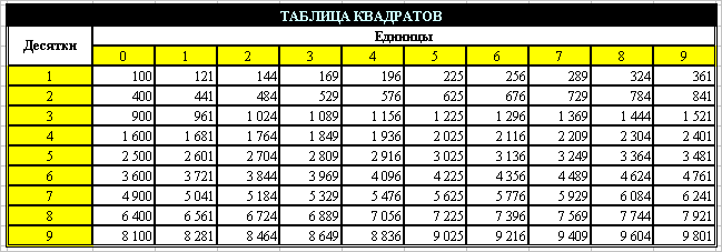 2. Сохраните книгу под именем Практика по Excel. 3. На втором листе рассчитайте и оформите таблицу квадратов (см. образец ниже). Используйте следующие функции: СТЕПЕНЬ (для возведения в квадрат), ЗНАЧЕН (преобразовать текстовое значение в число), СЦЕПИТЬ (для соединения десятков с единицами). Получится: СТЕПЕНЬ(ЗНАЧЕН(СЦЕПИТЬ(десятки;единицы));2) Таблица 2. Таблица квадратов