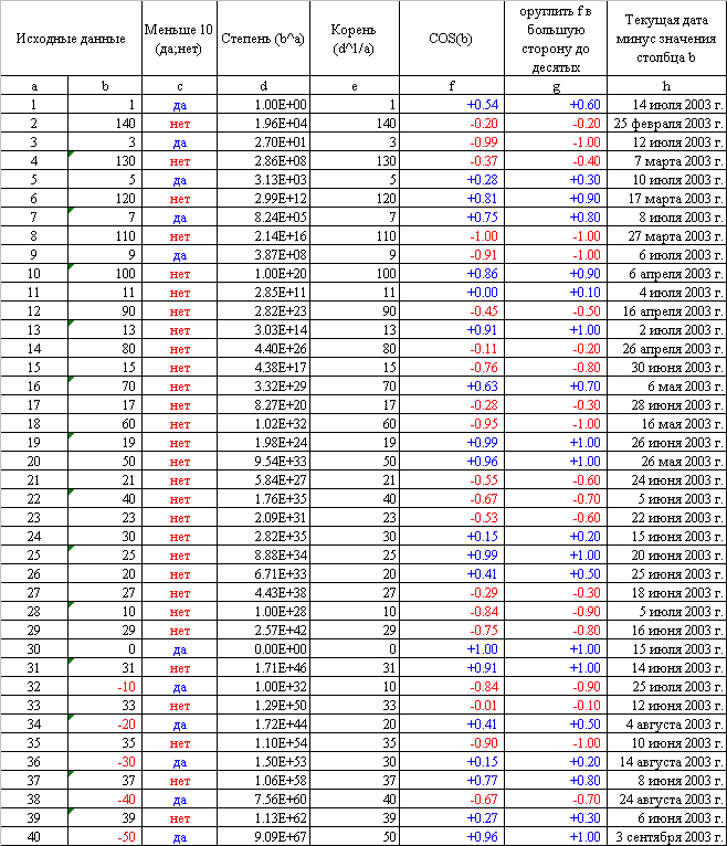 4. Переименуйте листы, так чтобы их названия отражали содержание таблиц. 5. На третьем листе создайте, рассчитайте и отформатируйте таблицу 3. Требования: - данные столбца А вводятся с использованием автозаполнения; - данные столбца В рассчитываются на основании первых двух ячеек (1 и 140), формулы пишутся в 3 и 4 ячейки и копируются во все остальные, для отображения различным цветом отрицательных и положительных чисел используйте формат ячейки; - столбец С рассчитывается с использованием функции логической ЕСЛИ, для отображения различным цветом отрицательных и положительных используйте условное форматирование меню формат; столбец D, Е, F и G рассчитываются с использованием соответствующих математических функций для отображения различным цветом отрицательных и положительных чисел используйте дополнительный формат числа в формате ячейки; - столбец H рассчитывается с помощью функции даты и времени ТекущаяДата, используйте дополнительные форматы отображения даты. Таблица 3. Использование функций