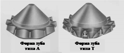Большинство зубьев имеют форму типа А: если посмотреть на них со стороны они похожи на букву А без палочки. Существуют также альтернативные формы, например зубья типа Т, который можно также наблюдать на рисунке. В некоторых дизайнах форма зуба может быть вида U или W. Такие формы используются для дополнительной стойкости вооружения. Такого рода зубья обычно располагают на калибрующем ряде шарошки, так как он наиболее подвержен износу. Увеличением количества стали на внешнем ряде, мы улучшаем стойкость долота, но при этом повышаем риск возникновения сальника.