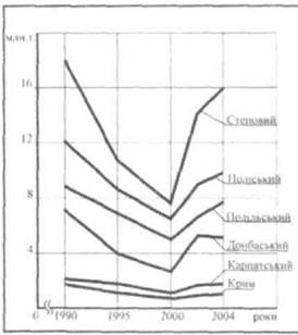 Розділ 4 ВИРОБНИЧА СФЕРА знаходяться на території Степового регіону — 5,7 млн. га або 37% від загальної площі під зерновими культурами в Україні, на території Поліського регіону відповідно 2,8 млн. га або 18 %, на території Подільського регіону відповідно 3,5 млн. га або 22%, на території Донбаського регіону — 2,2 млн. га або 14,3 %. Таблиця 4.6 Посівні площі сільськогосподарських культур за регіонами у 2004 р.