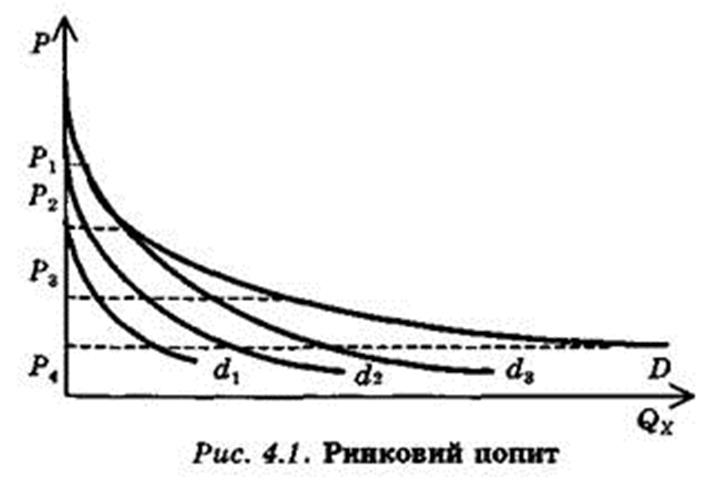 Перелік графічних моделей 1. Крива ринкового попиту 2. Крива ринкової пропозиції 3. Крива зрушення попиту внаслідок впливу на неї нецінових факторів 4. Ринкова рівновага попиту і пропозиції 5. Види еластичності попиту 6. Види еластичності пропозиції 7. Постійні, змінні та загальні (валові) витрати підприємства 8. Середні витрати підприємства 9. Крива А. Лаффера 10. Класична схема ділового циклу 11. Схема сучасного економічного циклу 12. Крива виробничих можливостей 13. Крива Лоренца Крива ринкового попиту показує загальний обсяг опиту всіх споживачів при будь-якій ціні (рис.4.1). Вона виникає шляхом складання індивідуальних попитів. Оскільки криві індивідуальних попитів мають від'ємний нахил, то і крива ринкового попиту також матиме відповідний нахил. Ринковий попит, з одного боку, залежить від тих Факторів, що впливають на індивідуальний попит, а з іншого — від самої кількості носіїв цього попиту, тобто від кількості споживачів (рис.4.2). На величину попиту, тобто на пересування точки по незмінній кривій попиту, впливає виключно ціна товару- Всі інші фактори, від яких залежить кількість товару, що споживачі готові придбати, належать до нецінових. їхня дія призводить до пересування самої кривої попиту на графіку вправо (збільшення попиту) чи вліво (зменшення попиту).