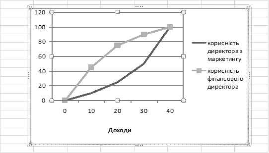 Форми кривих вказують на те, фінансовий директор має консервативні погляди і готовий втратити частину доходу заради стійкості, директор з маркетингу, навпаки, готовий ризикувати, щоб отримати більший дохід. Визначимо скільки одиниць продукції потрібно випустити з точки зору кожного директора за правилом сподіваної корисності: Qмаркетинг = (10000∙10+20000∙25+30000∙50+40000∙100)/(10+25+50+100) = = = 83846,153 (од.) Qфіндир = (10000∙45+40000∙72+70000∙92+100000∙100)/(45+72+92+100) =63980,58(од.)