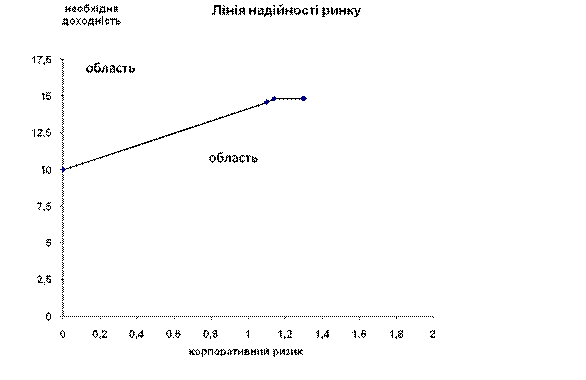 Для компанії, яка впроваджує новий проект, відомі такі показники: чутливість компанії до ринку до впровадження нового проекту - b=1,1; безризикова ставка – krf=8; середня доходність ринка – km=14; чутливість до ринку нового проекту - bн=1,3. Потрібно розрахувати необхідну доходність нового проекту, якщо 80% капіталу владується в існуючи проекти компанії і 20% - в новий проект. За розрахованими даними побудуйте лінію надійності ринка цінних паперів. Розв’язок. Лінія надійності ринку виражає залежність між ризиком інвестиційного проекту і його необхідною доходністю за формулою: k s = krf + (k m - krf)* b. Якщо компанія не використовує позичкові кошти, то інвестори будуть готові складувати кошти в її «середньризикові проекти», якщо сподіваються отримати доходи на рівні не нижче 14,6% (8%+(14%-8%)*1,1=14,6%). «Середньоризикові проекти» - це такі проекти які вже реалізовані і на основі яких розраховано значення b=1,1%. Якщо ми впроваджуємо новий проект, ризик якого відрізняється від середнього, тобто b н =1,3, то даний проект змінює b- коефіцієнт компанії, а, відповідно, і необхідну прибутковість капіталу. Так як b будь-якого портфеля інвестицій визначається як середньозважена величина b-коефіцієнтів проектів, що його складають, то ризик портфеля з урахуванням нового проекту збільшиться і складе величину 1,14 (0,8*1,1+0,2*1,3=1,14). Це зростання ризику компанії може відштовхнути майбутніх інвесторів, якщо не буде компенсовано зростанням сподіваної доходності. Сподівана доходність повинна збільшитись до величини 14,84% (8%+(14%-8%)*1,14=14,84%). Таким чином, щоб залучити інвесторів, сподівана доходність компанії після впровадження нового проекту повинна зрости від 14,6% до 15,96%. Якщо доходність існуючих інвестиційних проектів повинна складати 14,6%, доходність компанії з урахуванням нового проекту 14,84%, то сподівана доходність нового проекту повинна бути не нижче 14,84% (0,8*14,6%+0,2* k% =14,84%; k= 14,84% або 8%+(14%-8%)*1,3=15,8%). Так, якщо компанія приймає новий проект, її корпоративний ризик, що виражається b-коефіцієнтом, зростає від 1,1 до 1,4, доходність від 14,6% до 14,84%, а доходність нового проекту повинна бути не менше 14,84%. Графічно цей взаємозв’язок зображено на рис.3.