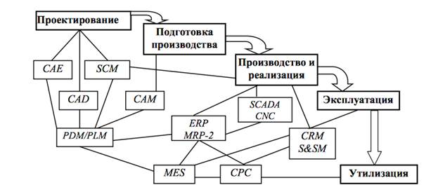 Основными компонентами CALS-технологий являются (рис. 2): · инструментальный комплекс технических и программных средств автоматизированного проектирования изделий (CAD – Computer Aided Design); · системы автоматизации технологической подготовки производства (CAM – Computer Aided Manufacturing); · системы инженерного анализа (CAE – Computer Aided Engineering); · средства реализации технологии параллельного тотального проектирования в режиме группового использования данных (Concurrent Engineering); · система управления проектными и инженерными данными (EDM – Enterprise Data Management); · системы визуализации всего процесса разработки документации (Project Management); · мощные средства хранения и управления данными о проекте (PDM– Product Data Management); · системы управления производством (MRP – Manufacturing Requirement Planning); · системы планирования и управления предприятием (ERP – Enterprise Resource Planning); · системы управления цепочками поставок (SCM – Supply Chain Management); · системы совместного электронного бизнеса (CPC – Collaborative Product Commerce); · системы управления продажами и обслуживанием (S&SM – Sales and Service Management); · программно-технологические средства, реализующие технологию создания и сопровождения информационных систем (CASE – Computer Aided Software Engineering); · SCADA; CNC; CRM; MES.