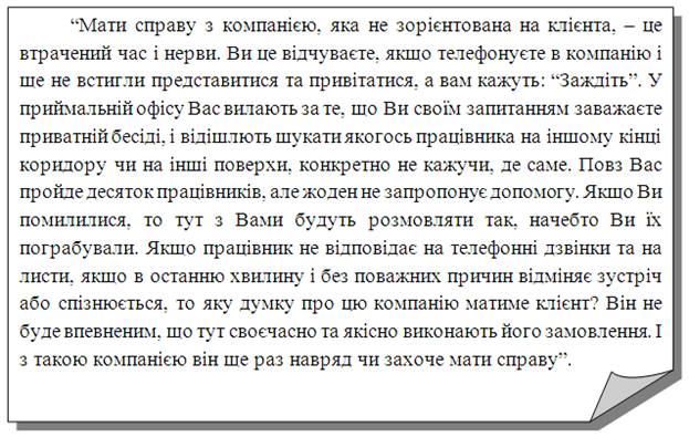 У відомих фірмах світу формується така лінія поведінки працівників, щоб, вступаючи у контакт з клієнтом, вони усвідомлювали себе єдиним у його очах представником компанії і при цьому знали, що від їхньої поведінки і від того, яке залишилося у клієнта про них враження, залежатиме його думка про організацію в цілому. Основне правило – дати зрозуміти кожному клієнту, що його цінують незалежно від обсягів коштів на його рахунку. Роздратування та неприязнь, які викличуть у клієнта байдуже ставлення до нього з боку окремого працівника, можуть призвести до втрати вигідного клієнта. До того ж один невдоволений клієнт передає своє незадоволення в середньому дев’ятьом іншим, а вони, в свою чергу, ще іншим [23].