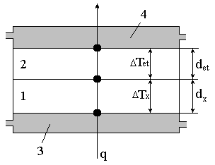 Метод Христіансена грунтується на використанні еталонного (зразкового) матеріалу, для якого коефіцієнт теплопровідності відомий заздалегідь[5]. Зразки досліджуваного 1 та еталонного 2 матеріалів – це пластини товщиною відповідно dx і dеt, які щільно прилягають одна до одної, а також відповідно до нагрівача 4 та холодильника 3. У стаціонарному стані розподіл температур у досліджуваному та еталонному матеріалах — лінійний і сталий, теплові потоки — однакові. Тому