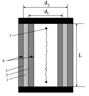 Останнім часом широко використовується метод циліндричного шару (рис. 2.5), особливо при дослідженні теплопровідності розплавлених металів і напівпровідників. Речовина 1 заповнює проміжок між коаксіальними циліндрами 2 і 3, де створюється сталий градієнт температури, який вимірюють термопарами 4.