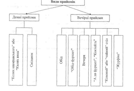 "Келих шампанського" Проводять між 12 та 13 годинами. Форма одягу - або "Келих вина" повсякденний костюм чи сукня. Під час такого при- йому подають лише сухе шампанське, вино, соки, а як закуску - тістечка, бутерброди, горіхи "Коктейль" Проводять між 17 та 20 годиною; триває близько двох годин. У запрошенні зазначають час початку та закінчення прийому. Господар і господиня стоять біля входу, зустрічають та проводжають гостей. Офіціанти розносять бокали з коктейлями. Як закуску подають міні-тістечка, печиво "А ля фуршет" Проводять тоді, коли й "Коктейль". Форма одягу - повсякденний костюм чи сукня, якщо інше не зазначено в запрошенні. Закусок на фуршетному столі значно більше, ніж на "Коктейлі". Стіл високий, щоб зручно було їсти стоячи, відповідно сервований "Обід" Найбільш урочистий вид прийому. Проводять між 19 - 21 годинами. У лівому нижньому кутку запрошення зазначають форму одягу; "White tie" (фрак), "Black tie" (смокінг), "Evening dress" (вечірній одяг, це також фрак), інколи "Undress" (простий костюм). Дами мають бути у вечірніх сукнях, хоча в запрошенні, як правило, це не зазначають "Обід-буфет" Різновид "Обіду" (інколи його називають "шведський стіл"). ("шведський стіл") Його проведення не передбачає розміщення гостей за столом. Стіл сервірують у вигляді буфетної стійки "по-шведськи", у приміщенні також є маленькі столики, за які можна сідати "Вечеря" Починають о 21 годині і пізніше. Від "Обіду" відрізняється лише часом початку та тим, що на даному прийомі не подають перші страви. Форму одягу зазначають у запрошенні - темний костюм, смокінг чи фрак; для жінок - вечірня сукня "Кавовий" або "чайний" На каву запрошують з 17 до 19 години, а на чай - до стіл 20 години. Прийом проходить у менш офіційній обстановці. Для кавового або чайного столу підбирають кольорові скатертини та серветки. Подають маленькі бутерброди, пиріжки, солодке або солоне печиво, торт, шоколадні цукерки Бізнес-ланч - діловий обід, ділова зустріч у ресторані Правила організації і проведення бізнес-ланчу • Для зустрічі з давнім партнером підійде будь-який першорозрядний ресторан, повсякденний одяг. • Для особистих контактів з потенційним партнером, іноземним інвестором чи компаньйоном необхідно вибирати відповідне місце зустрічі. За кордоном - це бізнес-клуби. У нас може підійти ресторан з українською кухнею, оформлений у національному стилі. Ініціатор зустрічі - сторона, що приймає. • Одягатися слід старанно. • Сідати слід так, щоб гість сидів праворуч. Навпроти сидять одружені або близькі знайомі. • Розмову починати слід доти, доки не принесли замовлені страви. На столі не повинно бути паперів чи зразків продукції. • За спільним рахунком розраховується сторона, що приймає. Робити це краще кредитною карткою. • Слід подякувати гостю, незалежно від результату. Через деякий час можна ще раз висловити задоволення від приємно проведеного часу
