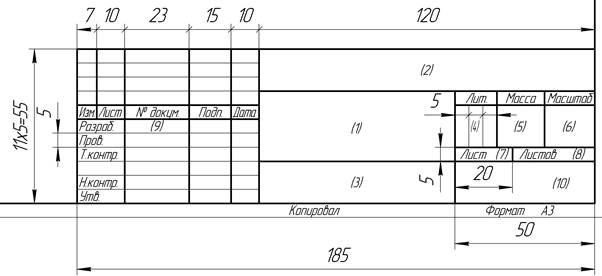 1.2. Надписи на титульном листе выполняются предварительно на миллиметровке, проверяются преподавателем и наклеиваются на ватман формата А3. 1.3. Форматы листов определяются размерами внешней рамки, задание выполняется на формате А3 (297 х 420). Каждый лист должен иметь внутреннюю рамку (рис. 2), которая наносится сплошной основной линией толщиной S в пределах 0,8 … 1 мм. Поле с левой стороны предназначено для подшивки и брошюровки чертежей. 1.4. Чертежи задания могут выполняться на форматах, взятых как горизонтально, так и вертикально (рис. 2 а,б). В зависимости от этого осуществляется оформление листов основной надписью 1 и дополнительной графой 2. В правом нижнем углу чертежа размещают основную надпись (рис. 3), дополнительная графа 2 выполняется только вдоль длинной стороны формата, кроме формата А4 (210 х 297). В графах основной надписи указывают: в графе 1 – наименование изделия; в графе 2 – обозначение чертежа; в графе 3 – обозначение материала детали; в графе 4 – литеру, присвоенную данному документу; в графе 5 – массу изделия; в графе 6 – масштаб; в графе 7 – порядковый номер листа; в графе 8 – общее число листов; в графе 9 – фамилии лиц, подписавших документ; в графе 10 – номер группы.