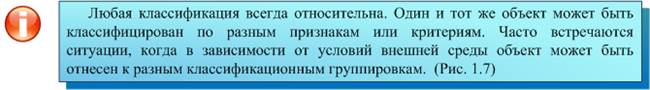 Рис. 1.1.9.1. Пример иерархической системы классификации. Учитывая достаточно жесткую процедуру построения структуры классификации, необходимо перед началом работы определить ее цель, т.е. какими свойствами должны обладать объединяемые в классы объекты. Эти свойства принимаются в дальнейшем за признаки классификации. В иерархической системе классификации (рис. 1.1.9.1) каждый объект на любом уровне должен быть отнесен к одному классу, который характеризуется конкретным значением выбранного классификационного признака. Для последующей группировки в каждом новом классе необходимо задать свои классификационные признаки и их значения. Таким образом, выбор классификационных признаков будет зависеть от семантического содержания того класса, для которого необходима группировка на последующем уровне иерархии. Количество уровней классификации, соответствующее числу признаков, выбранных в качестве основания деления, характеризует глубину классификации.