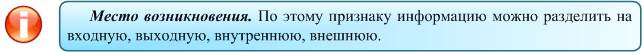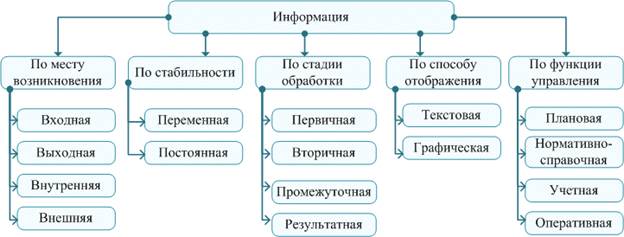 Стадия обработки. По стадии обработки информация может быть первичной, вторичной, промежуточной, результатной. Способ отображения. По способу отображения информация подразделяется на текстовую и графическую. Стабильность. По стабильности информация может быть переменной (текущей) и постоянной (условно-постоянной). Переменная информация отражает фактические количественные и качественные характеристики производственно-хозяйственной деятельности фирмы. Она может меняться для каждого случая как по назначению, так и по количеству. Например, количество произведенной продукции за смену, еженедельные затраты на доставку сырья и т.п. Постоянная (условно-постоянная) информация — это неизменная и многократно используемая в течение длительного периода времени информация. Постоянная информация может быть справочной, нормативной, плановой: