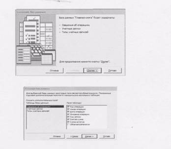 12-сурет. «Деректер қорының» жапсырмасы Тізімнен сізге барынша сэйкес келетін деректер қоры үлгісін таңдаңыз да, ОК батырмасын басып, деректер қорын қүру шеберін орындауға қосыңыз. «Жаңа деректер қоры файлы» диалог терезесінде ашылған. Бума тізімінен қүрылатын деректер қорын орналастыратын буманы таңдап, Создать батырмасын басыңыз. Келесі диалог терезесінде шебер өзі құрған деректер қоры қандай ақпараттан түратынын хабарлайды. Осы диалог терезесінің төменгі жағында мына батырмалар бар: Отмена - шебердің жұмысын тоқтатады. Назад - шебер жұмысының алдыңғы қадамына қайта келеді. Далее - шебер жү_мысының келесі қадамына барады. Готово - орнатылған параметрлерімен деректер қорына шеберді жібереді. Жүмысты жалғастыру үшін Далее батырмасын басыңыз. Ашылған диалог терезесі (12-сурет) екі тізімнен тұрады. Олардың бірі - деректер қорының кестелер тізімі, ал екіншісі -таңдалынған кестенің өрістер тізімі. Бұл тізімде кестеге енгізілген өрістер тіркелген. Көбіне кестенің барлығының дерлік, сирек қолданылатындарынан басқа, өрістері тіркелген. Өрістер үшін жалаушаларды орнатып немесе алып тастау, кестенің өрісін таңдай алауға болады. Кесте өрісін таңдаған соң, Далее батырмасын басыңыз.