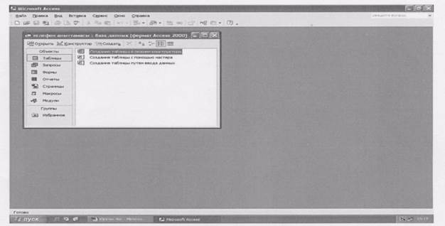 20-сурет.Деректер қорын ашу терезесі Access терезесінің жалпы түрі 2.2-суретте көрсетілген. Негізгі меню ағымындағы жүмыс режиміне байланысты өзгеріп отырады, оның құрамында келесі пункттер болуы мүмкін: Файл(Ғііе), түзету(Есііі), Typ(view), кірістіру (Insert), cepBHc(Tools), терезе(Window), niiiiiM(Format), жазбалар(КесогсІ8), сұраныстар (Query),icKe қосу(Яип), байланыстар (Relationships), сүзгі(Ғікег), анықтама? (Help). Меню пунктін Alt пернесімен бірге команда атының асты сызылған эріпті бір мезетте қатар басу жолымен немесе тышқанның сол жақ батырмасын шерту арқылы таңдауға болады.