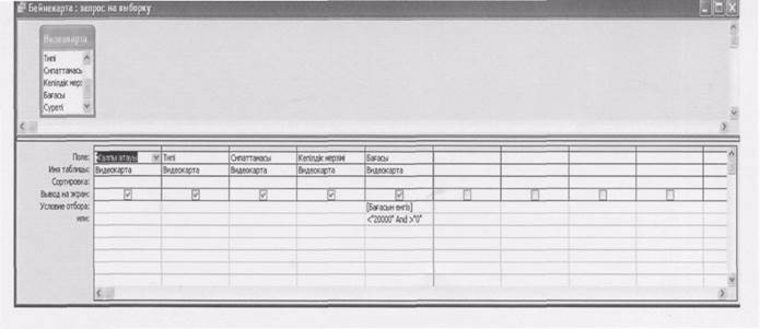 25-сурет. Конструктор режимінде сұраныс құру Бұл сұраныс атын «Бейнекарта» деп, оның «таңдау шартына» жэне «немесе» деген өрістеріне қалауымызша тік жақшалар орналастырамыз. Ол таңдауды жеке терезешеге енгізуді жэне сол арқылы жұмысымызды жеңілдетеді.