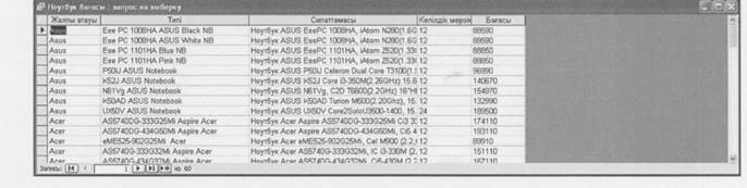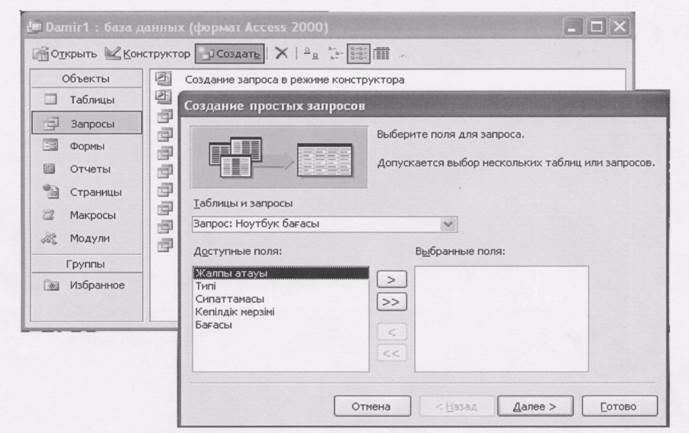 26-сурет. "Бейнекарта" сұранысын құру Екіншіден, сұранысты шебер (мастер) көмегімен құрамыз. Осы сұраныс режимінде сұраныс құру үшін осыған арналған Шебер іске қосылады, өрістерін таңдап алу негізінде жасалады. Шебер көмегімен сұраныс к^ру мысалын қарастыралық. 2.10-суретте сұраныс құру кезіндегі сұхбаттасудың бірінші қадамы көрсетілген. Мұндағы өрістер «Ноутбук бағасы» кестесінен алынады.. Бұл терезеден бірінші беттегі мәліметтерді екінші беттерге >/» батырмаларын басу арқылы көшіреді.