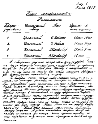 Эксперимент 2: СРАВНЕНИЕ ДВУХ МЕТОДОВ ЗАУЧИВАНИЯ ФОРТЕПЬЯННЫХ ПЬЕС — КАК ПРОТОКОЛИРОВАТЬ ЭКСПЕРИМЕНТ Студент-пианист по имени Джек Моцарт хочет заучивать фортепьянные пьесы наизусть. Для исполнения каждой пьесы Джеку требуется в среднем примерно 15 минут. Обычно он старался запомнить такую пьесу сразу от начала до конца, заглядывая в ноты только в случае крайней необходимости. Но недавно Джек задумался над тем, нет ли более эффективного метода. Он спросил себя, а что если разделить пьесу на три или четыре равные части и разучивать каждую часть по отдельности? Джек решил сравнить два метода заучивания 27пьес: целостный и частичный. Давайте посмотрим, как он это делал, посмотрим внимательно, следуя за ним буквально шаг за шагом. Итак, Джек хочет сравнить два метода заучивания пьес и определить, какой из них ему больше подходит. Сначала он выбирает для своего эксперимента четыре пьесы, по две на каждый из методов. Вот эти пьесы: 1. Бетховен. Соната № 30. 2. Бетховен. Соната № 31. 3. Дебюсси. Сюита для фортепьяно. 4. Равель. Сонатина. К счастью для нас, Джек — весьма пунктуальный молодой человек, и мы это скоро увидим. Например, он всегда занимается в одно и то же время. На собственном печальном опыте ему пришлось убедиться, что соседи любят ложиться спать рано вечером, а утром — поспать подольше. Он знает также, что наиболее продуктивно, не слишком уставая и не страдая от скуки, он может заниматься не более трех часов в сутки. Поэтому он занимается от 2 до 5 часов дня. Перед началом эксперимента Джек готовит все необходимое, и прежде всего лабораторный дневник для записи всей экспериментальной информации. Он выбирает сброшюрованную тетрадь в твердом переплете, и это очень разумно, ведь разрозненные листочки часто теряются. На. обложке он пишет: «Джек Амадей Моцарт (это его полное имя). Эксперимент по заучиванию фортепьянных пьес: целостный метод vs частичный метод». Затем Джек открывает тетрадь и в верхнем углу лицевой страницы пишет: «Страница 1», а чуть ниже — текущее число. Затем — заглавие: «План эксперимента». В своем плане он отмечает последовательность разучивания пьес и метод, который он намерен применить для каждой из них. Кроме того, он фиксирует время, необходимое для исполнения пьесы. Он разделяет пьесы на пары примерно равной величины, подобного стиля, одинаковой трудности. Полностью его план представлен на рис. 1.2. Можно убедиться, что длина пьес и тип музыки подобраны для обоих методов довольно успешно. Это не случайно: Джек хочет разучить две пары пьес, прячем пьесы каждой пары должны соответствовать друг другу по трудности. И наконец, Джек описывает, каким образом он будет применять каждый из методов заучивания. Итак, описано все, что необходимо Джеку для проведения эксперимента. И ему уже не нужно держать вое это в голове. Он может заглянуть в дневник через годы и получить точные сведения о планировании своего эксперимента. А если его навестит друг, Джек сможет показать ему свой дневник и тот тоже будет, знать об эксперименте буквально все. Правда, выносить тетрадь из комнаты для занятий, скажем, -давать ее другу на дом, Джеку не хочется: он опасается ее потерять.