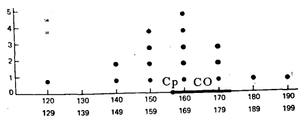 Более полная картина оценок ВР, полученных в эксперименте, дается распределением частот. Выше такое распределение показано для условия Б (звуковой тон).Мы видим, что в этом распределении каждая оценка представлена не всегда точно, поскольку оценки сгруппированы в классы интервалов: 120—129, 130—139, 140—149 и т. д. Величина всех интервалов в данном случае равна 10 мс.Это та величина, на которую каждый нижний предел увеличивается от интервала к интервалу (например, от 150 до 160—это 10 мс). Число интервалов здесь равно 8; соответственно имеется 8 колонок. Если бы число оценок показателей времени реакции было больше, чем 17, можно было бы использовать несколько большее число интервалов. Например, если бы было 100 проб, число используемых интервалов могло быть 15 или даже 20. При 15 интервалах нижний интервал был бы 120—124, следующий 125—129 и т. д. до 190— 194. В этом случае величина интервала равнялась бы 5 мс. Таблица 3.3 Вычисления среднего и стандартного отклонения на основе интервальных данных