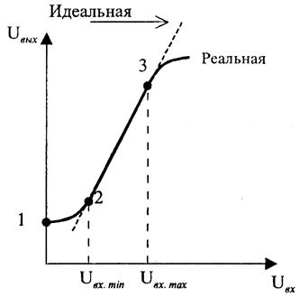 выходе усилителя, вызванные изменением сопротивления нагрузки. Рассмотрим основные характеристики усилителей. Амплитудная характеристика – это зависимость амплитуды выходного напряжения (тока) от амплитуды входного напряжения (тока) (рис. 9.2). Точка 1 соответствует напряжению шумов, измеряемому при Uвх =0, точка 2 – минимальному входному напряжению, при котором на выходе усилителя можно различать сигнал на фоне шумов. Участок 2–3 – это рабочий участок, на котором сохраняется пропорциональность между входным и выходным напряжением усилителя. После точки 3 наблюдаются нелинейные искажения входного сигнала. Степень нелинейных искажений оценивается коэффициентом нелинейных искажений (или коэффициентом гармоник):