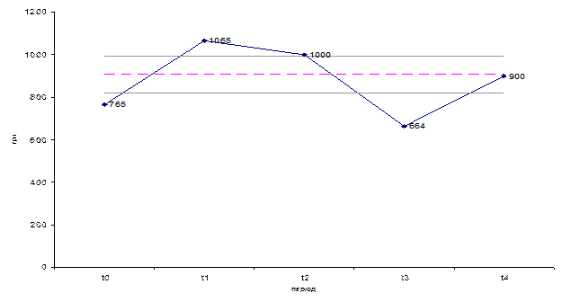 Формули розрахунку статистичних характеристик прибутку є аналогічними формулам 1.1-1.5. На основі рис.2 можна зробити наступні висновки: прибуток в кварталі t1 виріс на 39,2%, у другому кварталі виріс - на 30,7%, у кварталі t3 знизився - на 13,2%, а в четвертому кварталі відбулося зростання на 17,6% у порівнянні з базовим кварталом t0. У цілому за рік прибуток збільшився на 18.6%. Середнє значення прибутку – 907,25 грн. Відхилення від середнього значення – 87,9 грн., що складає 9,7%. Дана величина є резервом росту прибутку.