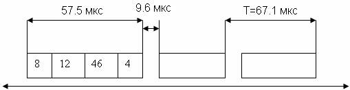 Для комунікаційного устаткування найбільш важким режимом є обробка кадрів мінімальної довжини. Це пояснюється тим, що на обробку кожного кадру міст, комутатор або маршрутизатор витрачає приблизно один і той же час, пов'язаний з переглядом таблиці просування пакету, формуванням нового кадру (для маршрутизатора) і т.п. А кількість кадрів мінімальної довжини, що поступають на пристрій в одиницю часу, більше, ніж кадрів будь-якої іншої довжини. При вказівці пропускної спроможності мереж терміни кадр і пакет звичайно використовуються як синоніми. Відповідно, аналогічними є і одиниці вимірювання продуктивності frames-per-second, fps і packets-per-second, pps. Для розрахунку максимальної кількості кадрів мінімальної довжини, що проходять по сегменту Ethernet, відмітимо, що розмір кадру мінімальної довжини разом з преамбулою складає 72 байт або 576 біт (рис. 3.5.), тому на його передачу витрачається 57,5 мкс.