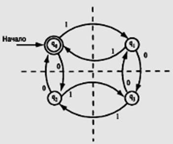 Решение. Выделим 4 состояния, запоминающих четное и нечетное число 0 и 1: